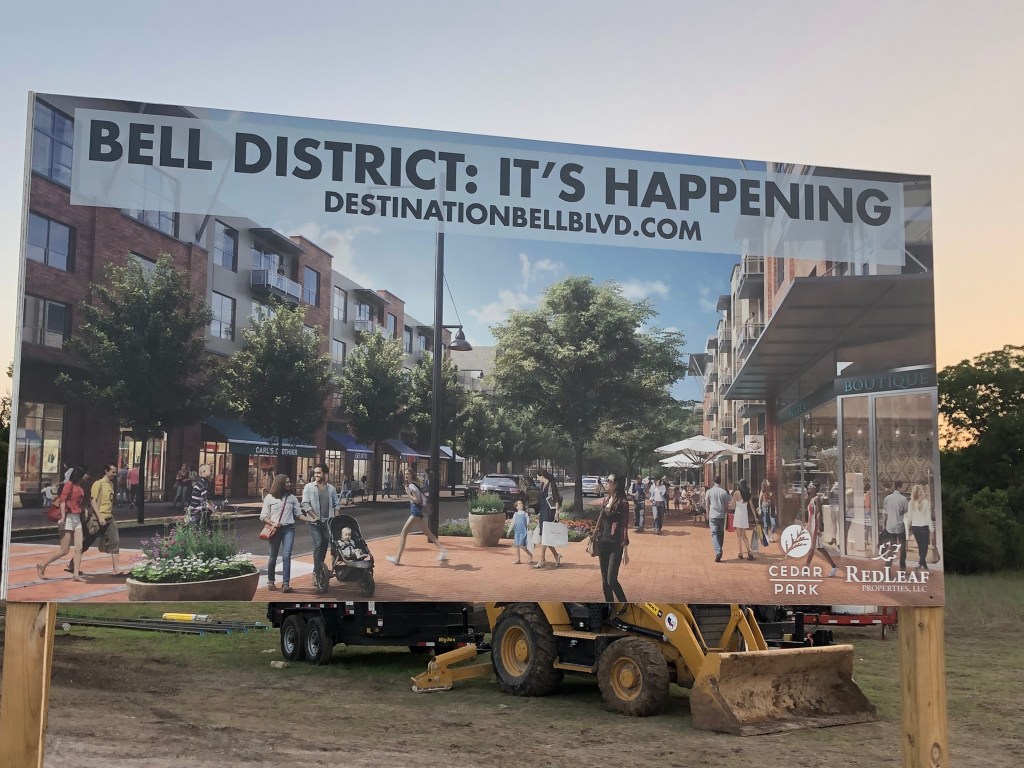 A lighted sign on Cedar Park’s North Bell Boulevard (US Highway 183) reads, “Road work to begin 9/28/20.” Monday morning, construction crews will start working on changes to the high-traffic corridor through the city in preparation for the Bell District, a redevelopment project for which several buildings have been razed and several more are marked for demolition. According to the City of Cedar Park’s Destination Bell Boulevard website, “At full build-out, the 50-acre Bell District is anticipated to include approximately 16 acres of greenspace, the City’s new library, a park and social hub, restaurants, multiple blocks of high-density residential, some with ground-floor retail, professional office space and individually-owned urban brownstones.”