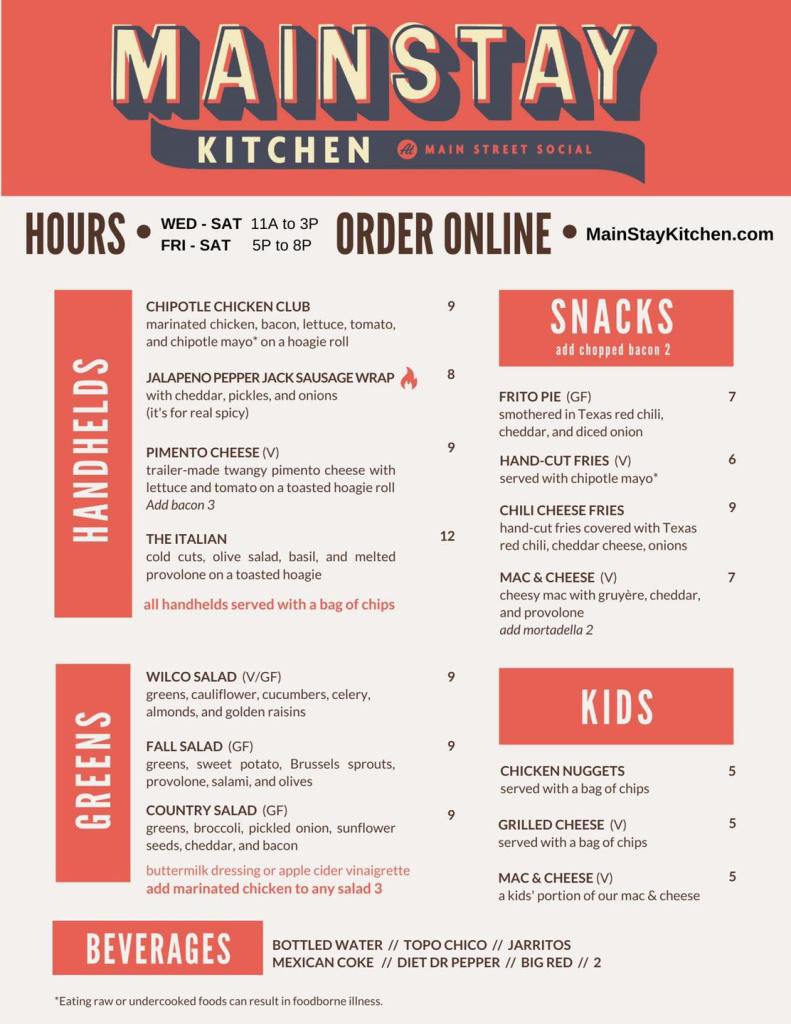 Mainstay Kitchen is now open and serving up American staples at Main Street Social food hall at 1651 Loop 332 in Liberty Hill, TX. Owners Jason and Amber Dodge say, “The menu will change often but the fresh ingredients and inventive take on American classics won’t. Come check us out at Mainstay Mobile where we’re giving you a preview of what we’ll be offering at Main Street Social. We’re parked right outside the food hall and we’re excited to meet you!”