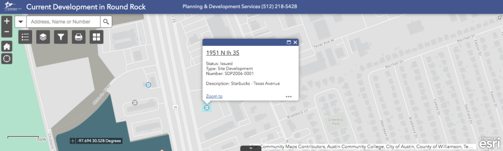 A site development permit has been issued for a new Starbucks at the intersection of IH 35 North and Texas Avenue in Round Rock. The location will be on the interstate’s northbound service road between Highway 79 and 3406.
