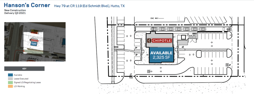 Promotional materials created for Hanson’s Corner, a large retail development in Hutto, indicate that Chipotle has signed a lease for a spot. The space accommodates a planned “Chipotlane” drive-thru with ample room for a queue of 8 cars. Hanson’s Corner is located at Highway 79 at CR 119 (Ed Schmidt Boulevard). Hutto residents should be able to get their burritos, bowls, tacos, and quesadillas closer home by early 2022 according to reporting by Community Impact.