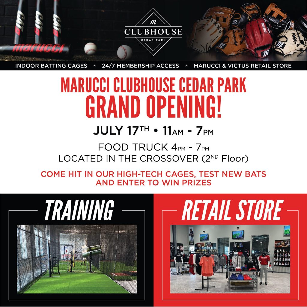The Marucci Clubhouse is a professionally-inspired indoor hitting facility that offers the Big League experience year-round right here in Williamson County. Join Marucci Clubhouse Cedar Park for their Grand Opening this Saturday, July 17th from 11am – 7pm in The Crossover at 1717 Scottsdale Dr Cedar Park, TX 78641. You can test new bats in their top of line batting cages. You will also have a chance to win prizes.