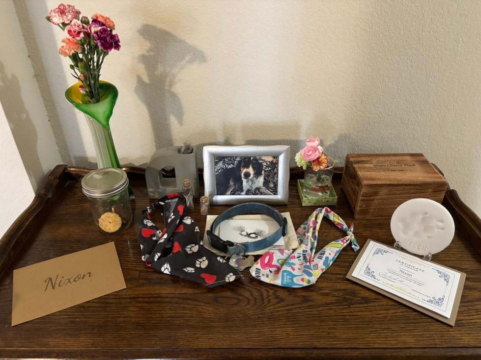 By Monday — just a few days later — they returned with another bouquet, along with a beautifully engraved urn bearing Nixon’s name and the years of his life. They also included a paw print keepsake, small glass jars holding clippings of his fur with cork stoppers and laser-engraved labels with Nixon’s name, and a wooden tag reading “Stardust” engraved with his name.